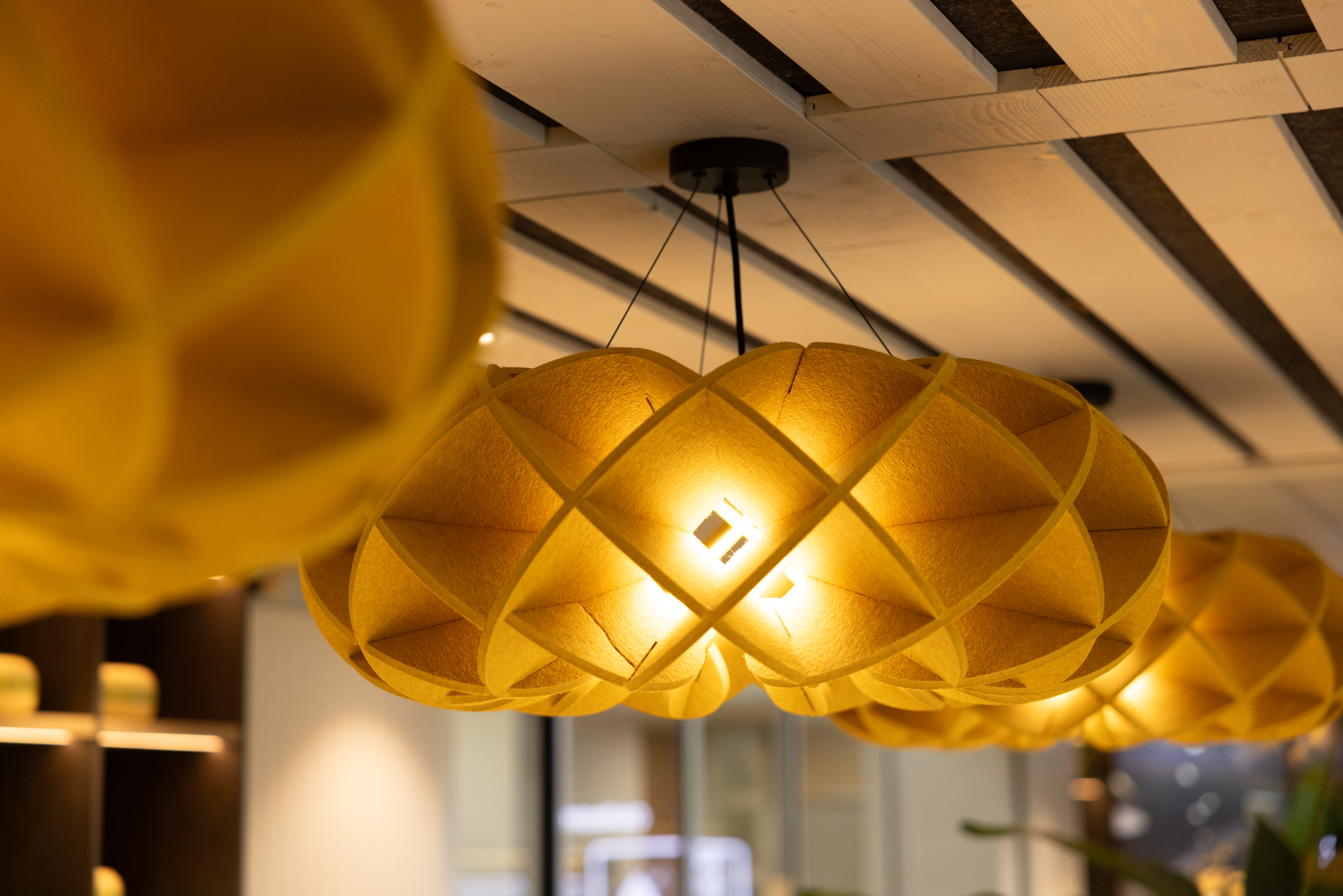 De ruimte is afgewerkt met echte designlampen in een opvallende gele kleur, die als subtiele eyecatchers dienen. Deze elementen geven het geheel een eigentijdse, creatieve uitstraling en versterken de identiteit van het merk.
